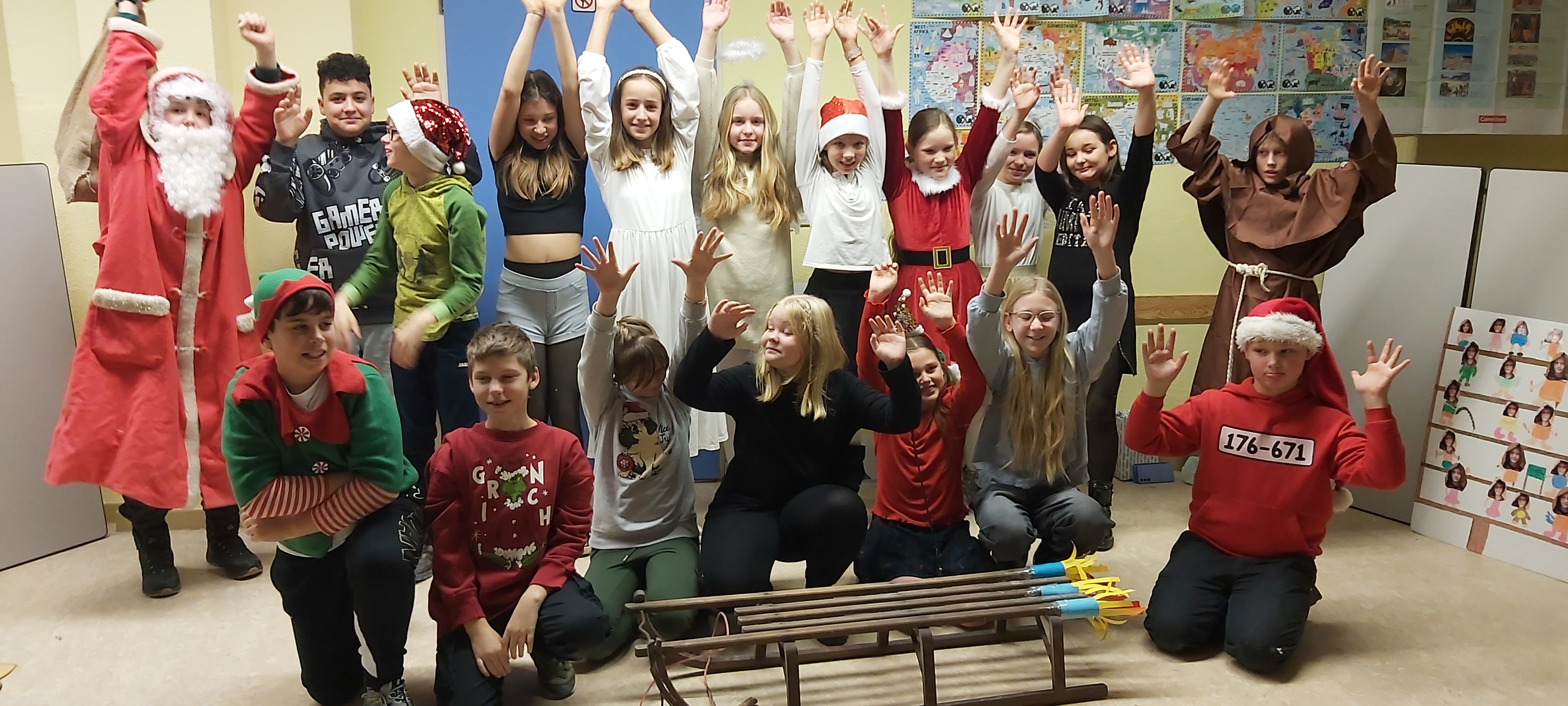 18.12.2026 Nach einer zweimonatigen Probenphase feierte die Klasse 5a die Premiere des Theaterstücks „Weihnachtsmann go!“. Schon vor dem angekündigten Beginn des Theaters um 17 Uhr