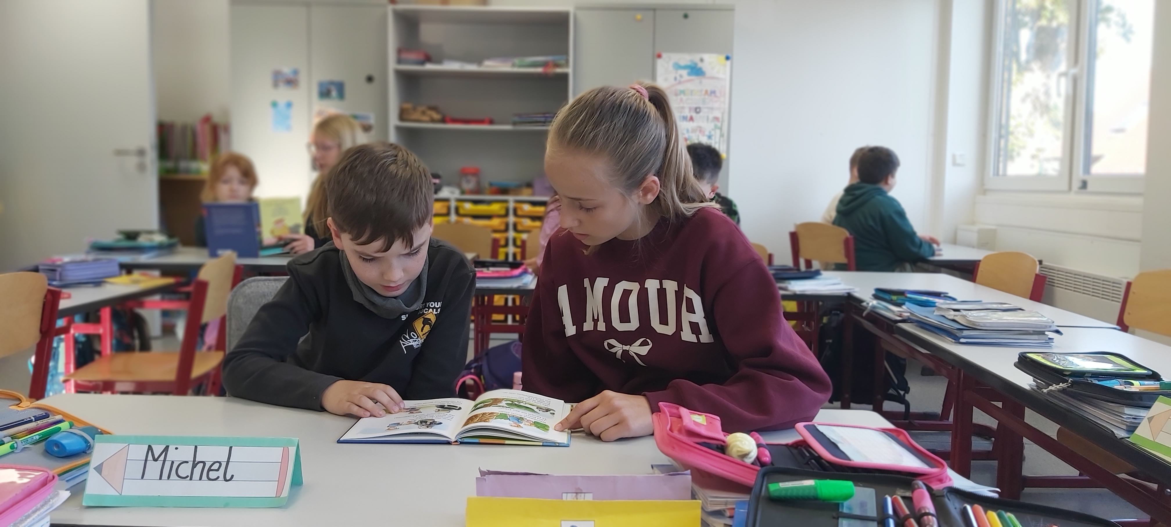 01.12.2025 In diesem Schuljahr haben die jetzigen Fünftklässler Lesepatenschaften für die diesjährigen Zweitklässler übernommen. Vierzehntägig treffen sich die Kinder der 2a mit den Schülerinnen und Schüler der 5a, während die Kinder der 2b von den Schülerinnen und Schülern der 5b besucht werden. Gemeinsam suchen sie sich Bücher aus, die sie spannend, interessant oder einfach ansprechend finden und lesen sich gegenseitig vor: die Großen den Kleinen und die Kleinen den Großen, abwechselnd und je nach Lust und Laune. Stimmengewirr und Bücherrascheln erfüllen dann die Räume, in denen gemütlich gelesen und über Bücher und Geschichten gesprochen wird. Und ganz nebenbei lernen sich die Kinder unterschiedlicher Klassenstufen kennen und achten. Ein Projekt, das auch auf die anderen Klassenstufen übertragbar wäre.