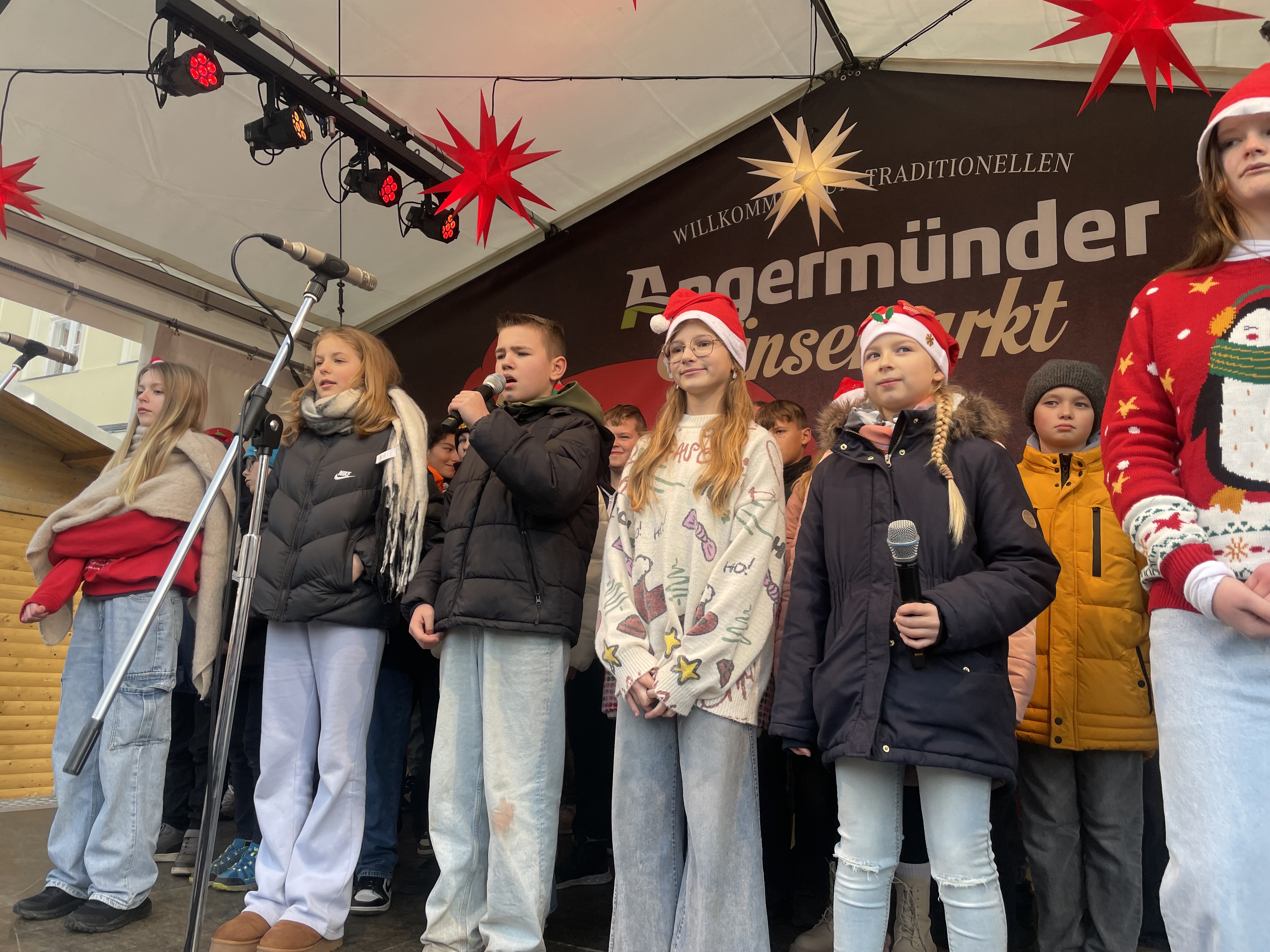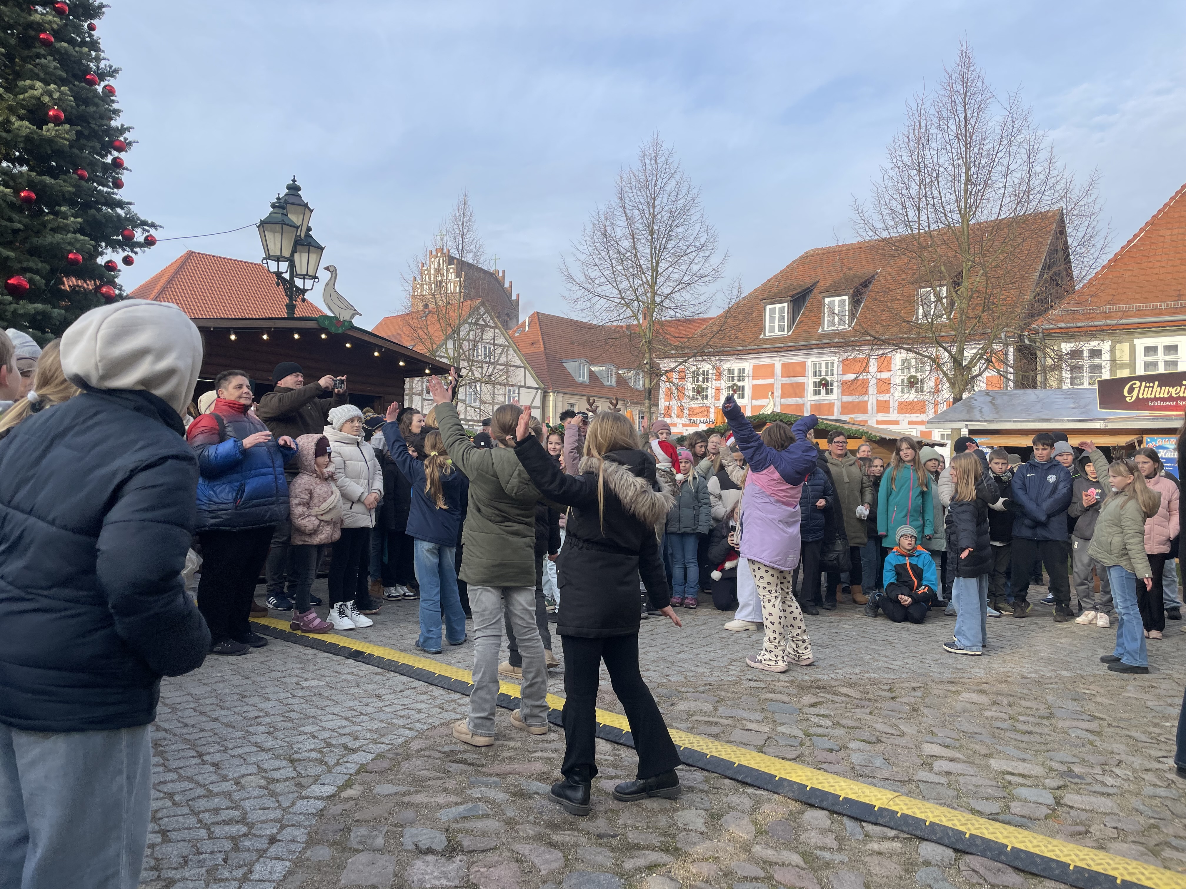 04.12.2025 Die Puschkinschule hatte heute die große Ehre, den Angermünder Weihnachtsmarkt – liebevoll auch Gänsemarkt genannt – feierlich zu eröffnen. Unsere Sechstklässler und einige Mädchen der Klasse 4b präsentierten ein beeindruckendes Programm, das aus einer stimmungsvollen Mischung klassischer und moderner Weihnachtslieder sowie einigen schwungvollen Tänzen bestand. Unter dem strahlenden Lichterglanz des wunderschön geschmückten Marktplatzes und dem riesigen Tannenbaum erfüllten besinnliche Klänge die winterliche Luft. Viele Besucherinnen und Besucher berichteten sogar von Gänsehautmomenten – ein Zeichen dafür, wie gelungen und mitreißend der Auftritt war. Unsere Schülerinnen und Schüler haben mit großem Engagement und viel Herzblut geprobt, um diesen besonderen Moment zu gestalten. Dafür danken wir ihnen von ganzem Herzen. Ein besonderer Dank gilt außerdem unserer Musiklehrerin Frau Lindenberg, die mit ihrer Leidenschaft und ihrem Einsatz dieses wunderbare Programm möglich gemacht hat