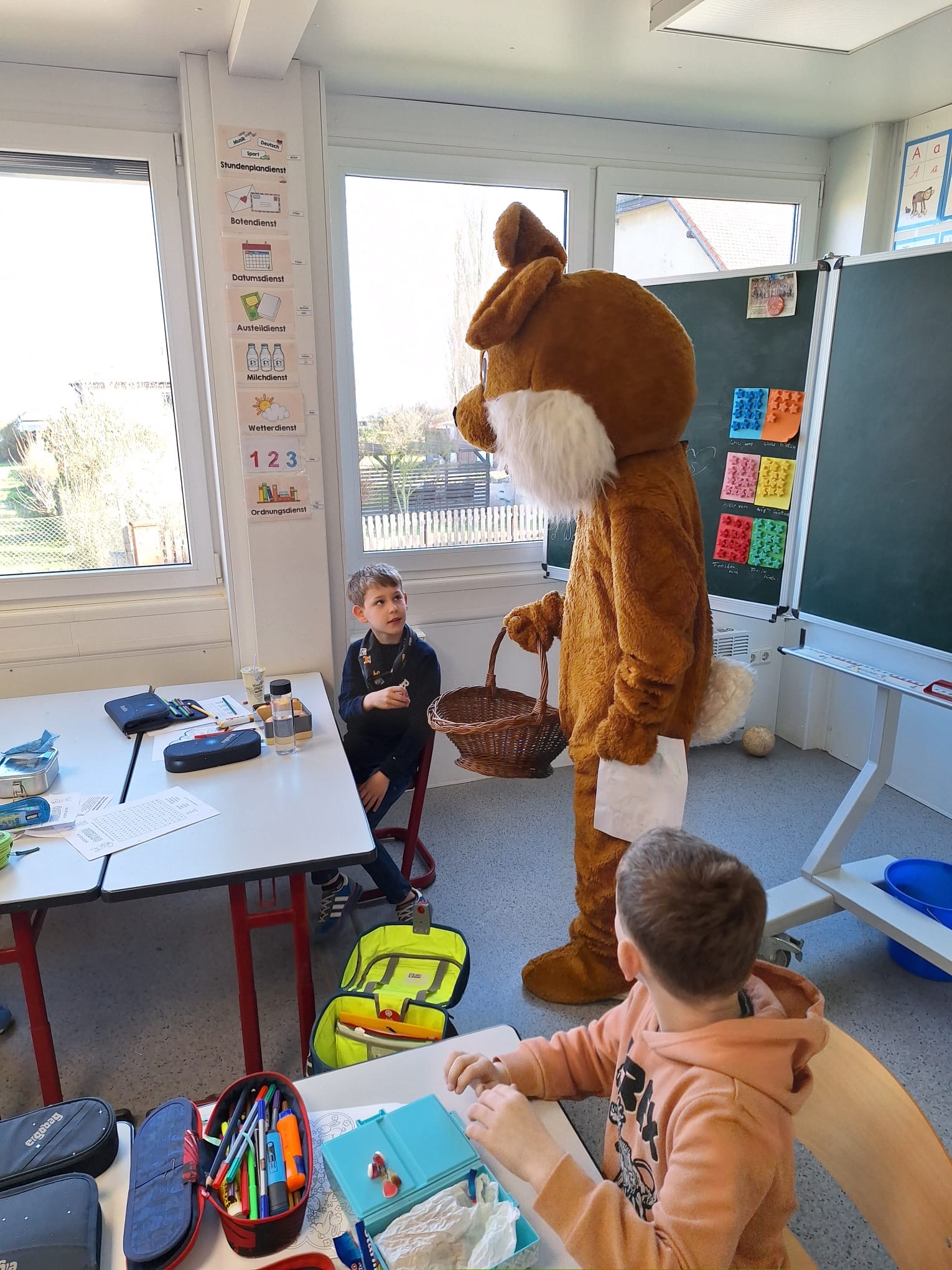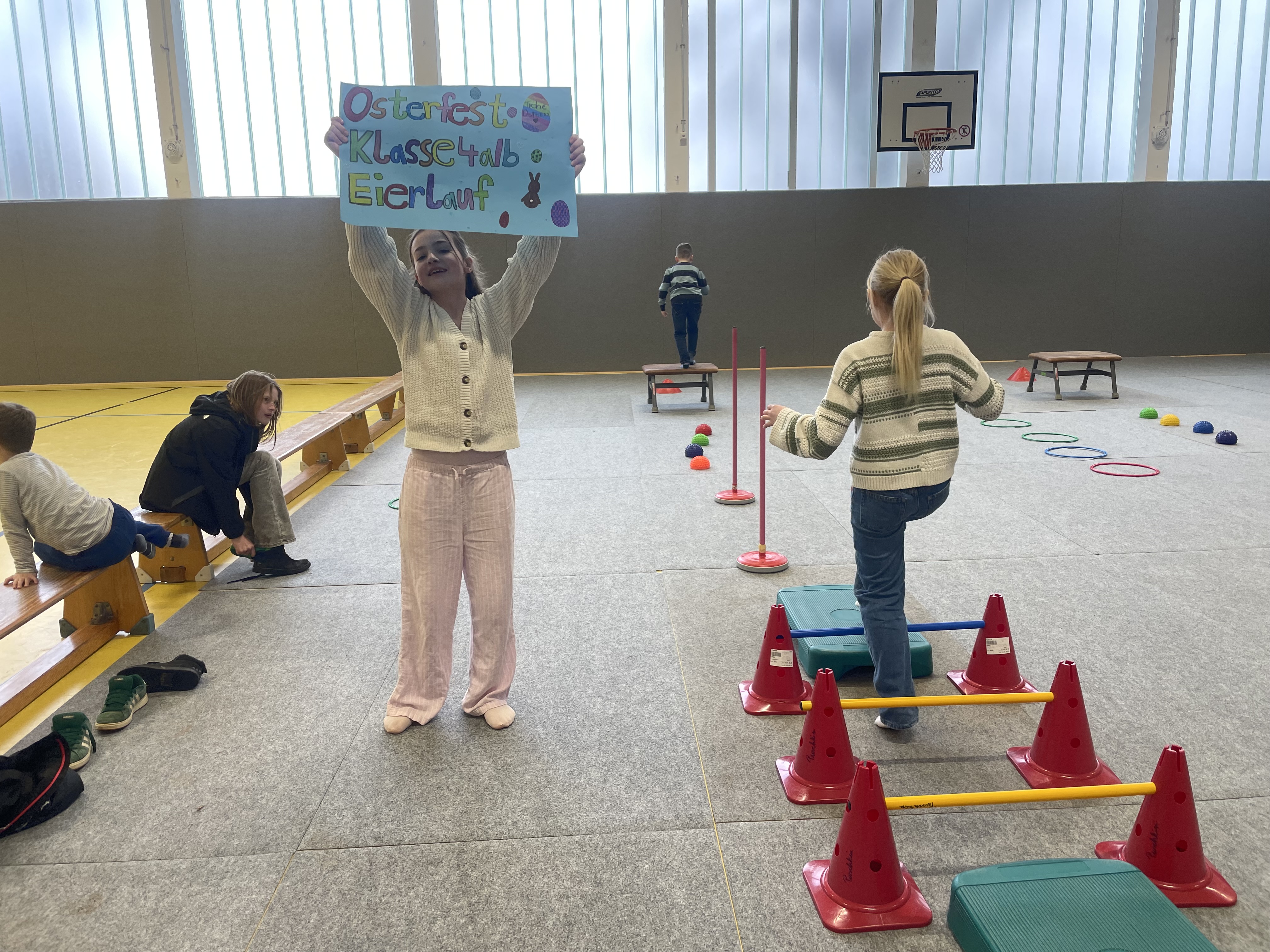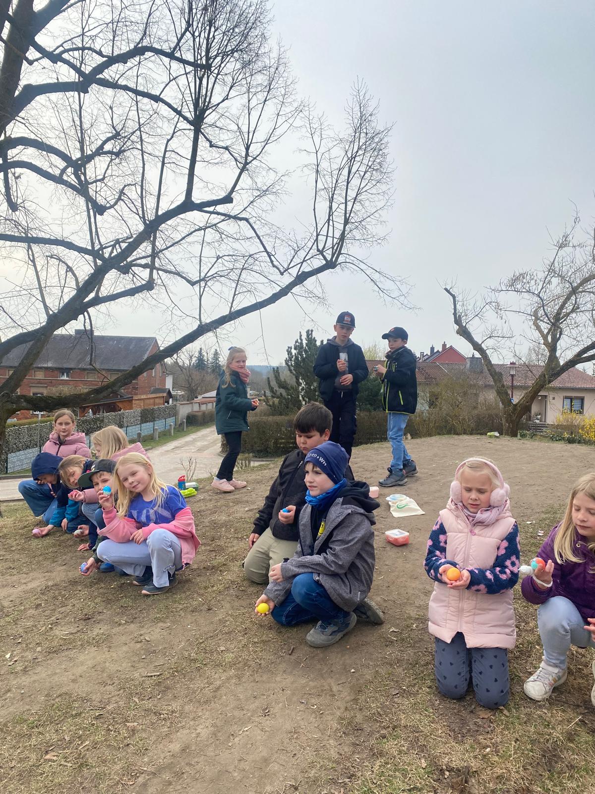 27.03.2026 In der letzten Schulwoche vor den Osterferien wurde es bei uns noch einmal besonders lebendig und bunt. In vielen Klassen fanden kleine Ausflüge oder kreative Osterprojekte statt, bei denen gebastelt, gestaltet und gemeinsam gelacht wurde. Ein besonderes Ereignis für die Kinder war dabei das traditionelle Eiertrudeln, das für viel Freude und Begeisterung sorgte. Unser tolles Osterfest krönte die letzte Schulwoche, zu dem wir alle Schülerinnen und Schüler sowie ihre Familien herzlich willkommen heißen durften. Organisiert wurde das Fest mit viel Engagement von unserem Förderverein und unseren Schulmitarbeitenden sowie HorterzieherInnen und vielen helfenden Eltern – dafür ein ganz herzliches Dankeschön! Trotz des durchwachsenen Wetters war das Fest sehr gut besucht und die Stimmung durchweg fröhlich. Auf dem Schulhof, in der Turnhalle und im Schulgebäude gab es viele kleine Angebote und Aktionen zu entdecken. Eine Fotobox lud zu lustigen Erinnerungsfotos ein, während leckere Getränke, selbst gebackener Kuchen und ein toller Grillstand für das leibliche Wohl sorgten. Ein ganz besonderes Highlight war der riesengroße Osterhase, der mit guter Laune unterwegs war und für strahlende Gesichter bei Groß und Klein sorgte. Begleitet von Musik und fröhlichem Miteinander haben sich alle bei uns sehr wohlgefühlt. Mit diesen schönen Eindrücken verabschieden wir uns in die Osterferien und wünschen allen Familien eine erholsame Zeit, sonnige Frühlingstage und ein fröhliches Osterfest!